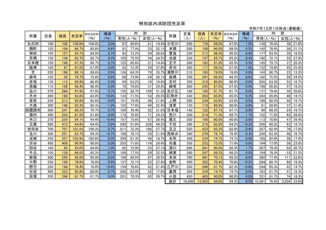 令和7年12月1日時点の特別区消防団充足率表(速報値)を掲示します。