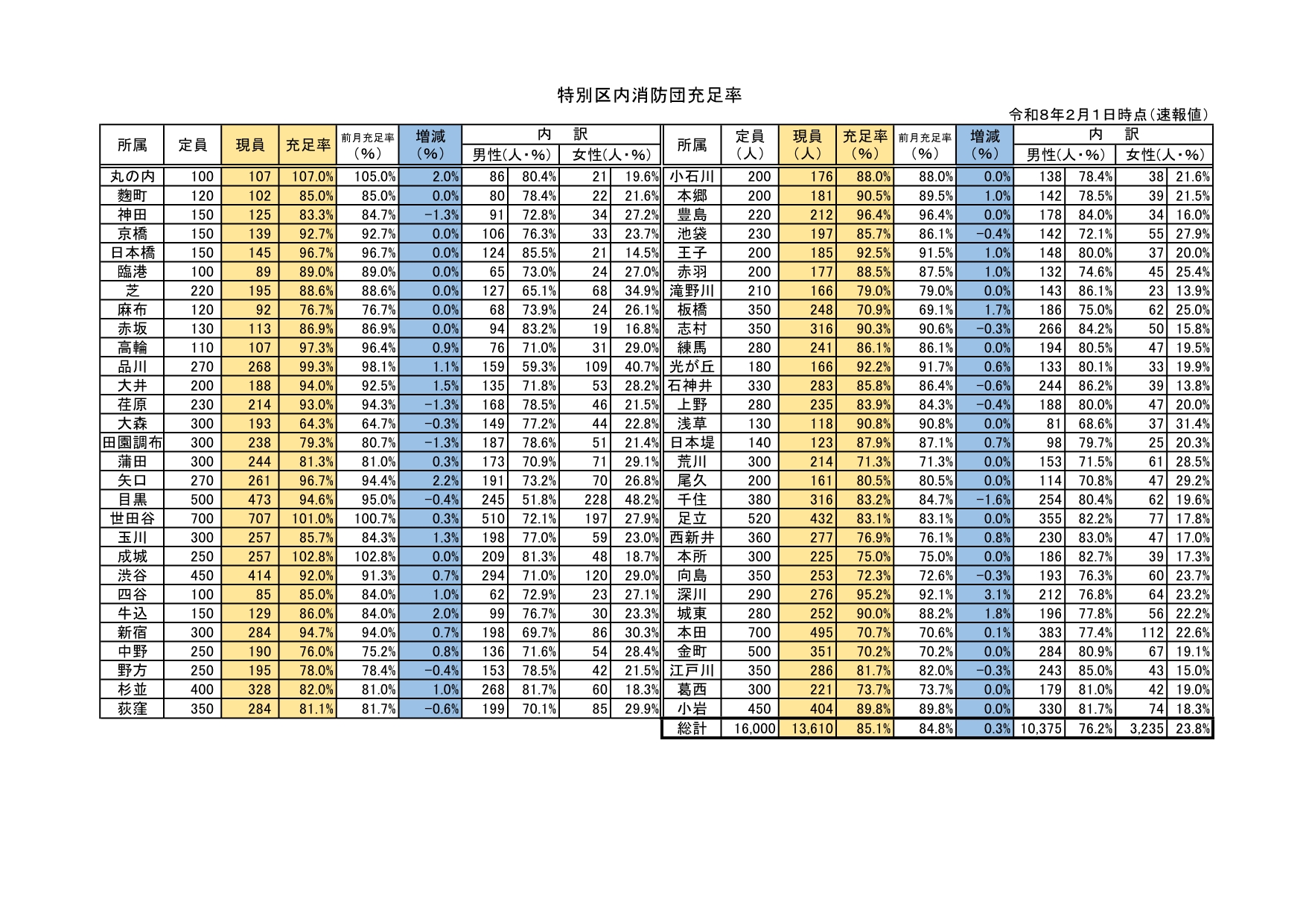 令和8年2月1日時点の特別区消防団充足率表(速報値)を掲示します。